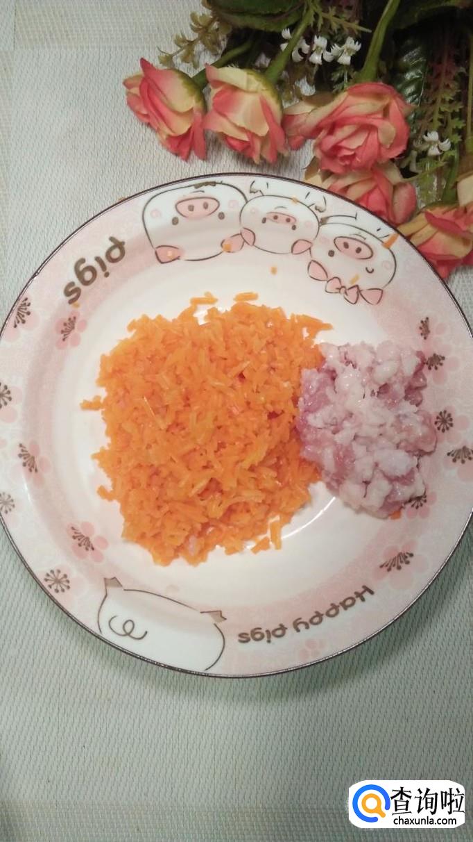 准备适量五花肉,洗净后,先切成薄片,再切碎,然后和胡萝卜一起放入盘中备用。