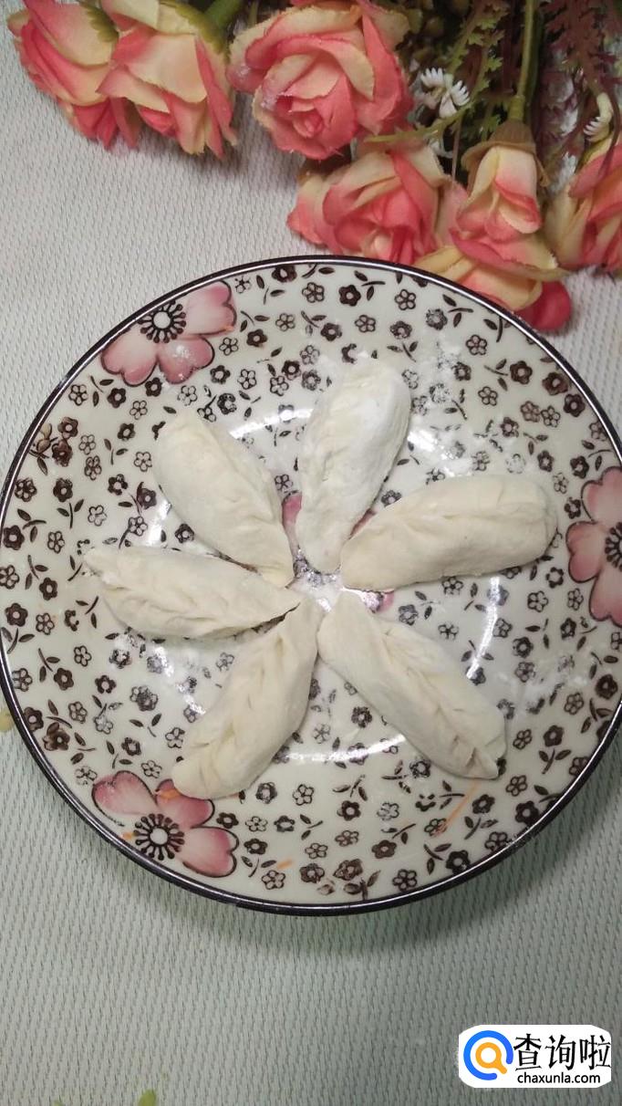 将拌好的馅儿放在面皮儿中,尽量放在中间,然后用手左右捏一下,捏成柳叶状。