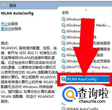 选择服务过后可以看到当前电脑已启用的服务设备,都是按照英文字母的顺序排列的。找到WLAN。