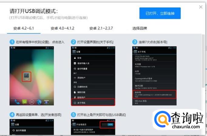 然后找到USB调试打开,用数据线与电脑连接,打开刷机精灵,进行设备连接。