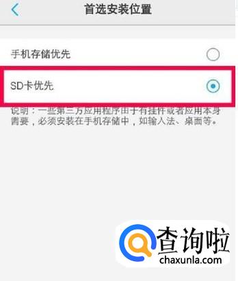 进入之后,选择“SD卡优先”即可将手机存储位置设置为SD卡存储,如图所示。