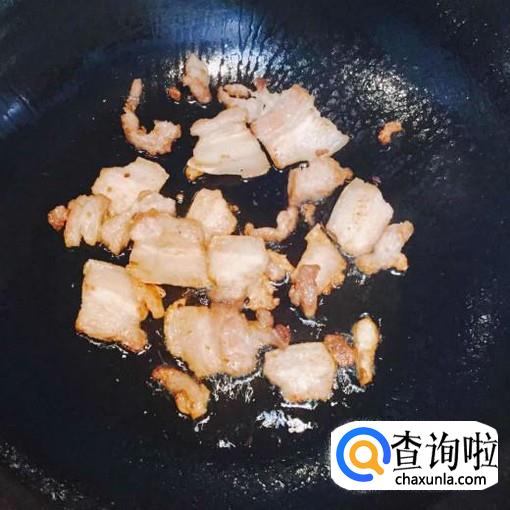 锅中放少许油(油不要放太多,一会煸炒五花肉还会出油),烧至五成热时下五花肉片,转小火慢慢把肉片熬出油。备注:所谓五成热是指油面比较平静,微有青烟冒起。