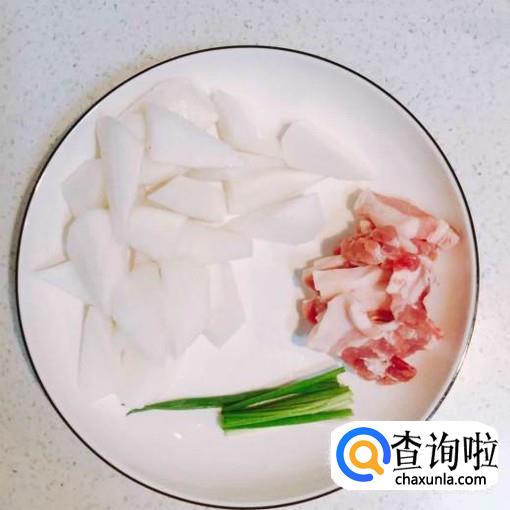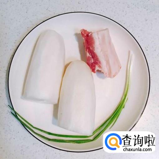 准备半根或一根白萝卜(依萝卜大小而定)、小香葱2-3根、五花肉适量,将这些食材洗净备用,白萝卜最好削一下皮。