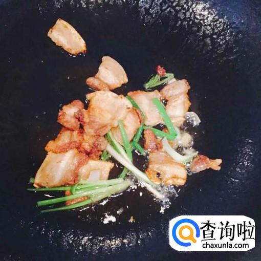 五花肉片煸出油呈金黄色时,把葱段扔进锅中,使肉片中增添小香葱的味道。