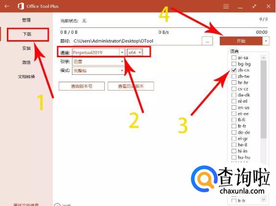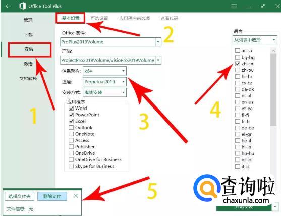 重启后,首先点击下载页面,选择Perpetual2019、x64、zh-cn。其他啊默认即可。注:Perpetual2019是office2019;如果电脑是64则选择x64,反之,则为x86;zh-cn为中文版。点击安装页面,然后选择基本设置。