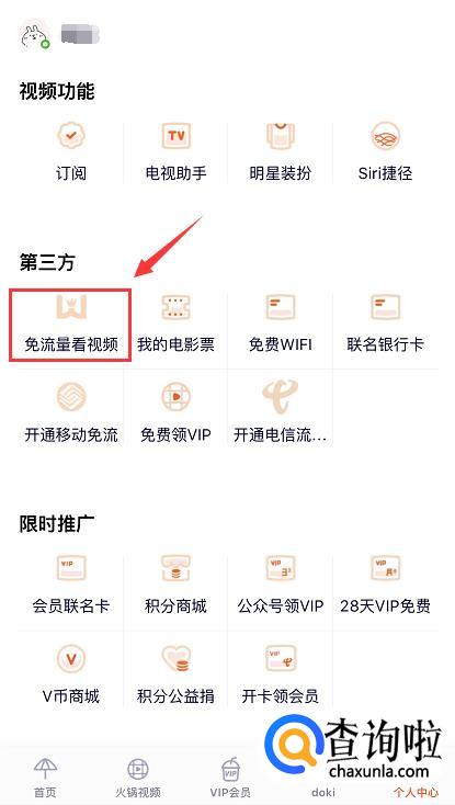 进入个人中心页面后,用手指触碰下滑,在“第三方”一栏下找到【免流量看视频】,点击进入。