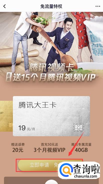 进入免流量特权页面,在该页面上我们可以看到两种卡,一种是腾讯视频卡,另一种就是腾讯大王卡,我们选择腾讯大王卡,点击【立即申请 免费体验】。