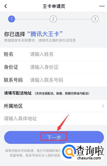 点击之后进入王卡的申请页面,按照要求输入你的姓名、身份证号码、手机号码,并填写你所属的地区和具体地址,然后点击【下一步】。
