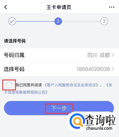 接着,这里会根据你所填写的地区为你分配号码,如果不满意还可以点击号码重新选择,选好之后勾选下面的“我已同意并阅读服务条例”,然后点击【下一步】完成申请。
