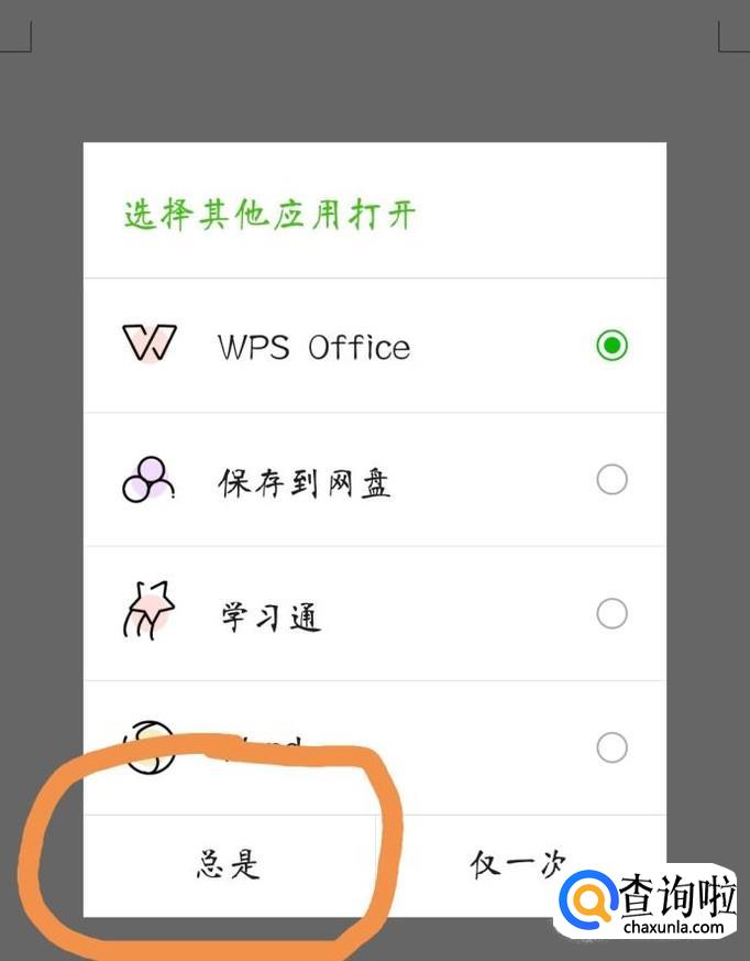 在出现的选项中选择自己想要的打开方式,最后点击“总是”选项。即可成功设置微信的word 文件默认打开方式。