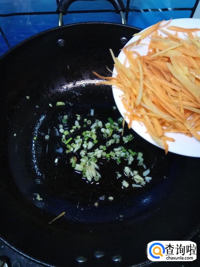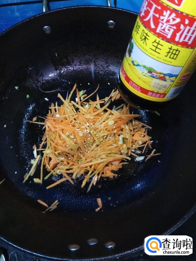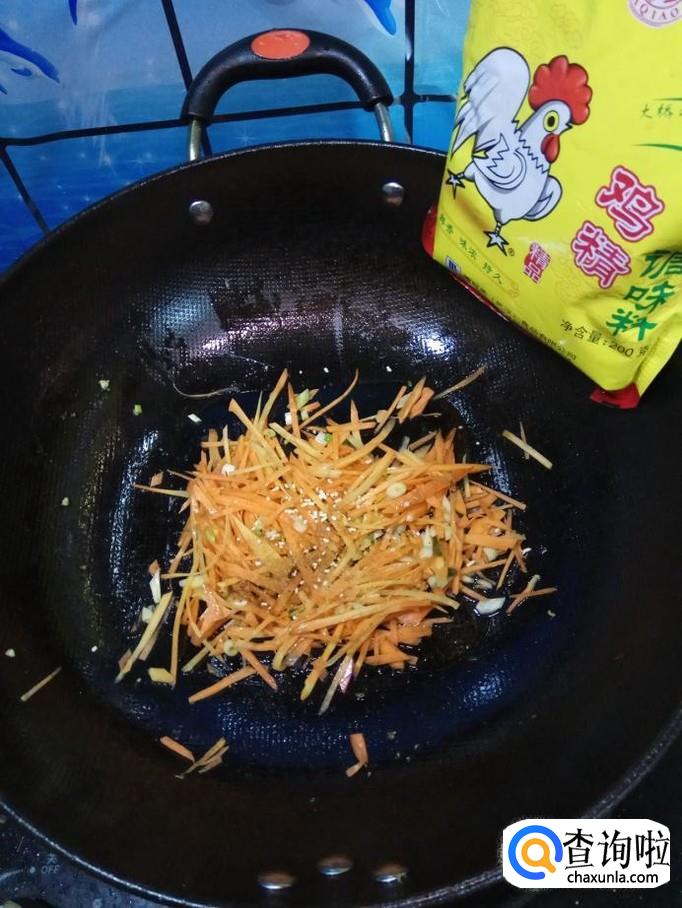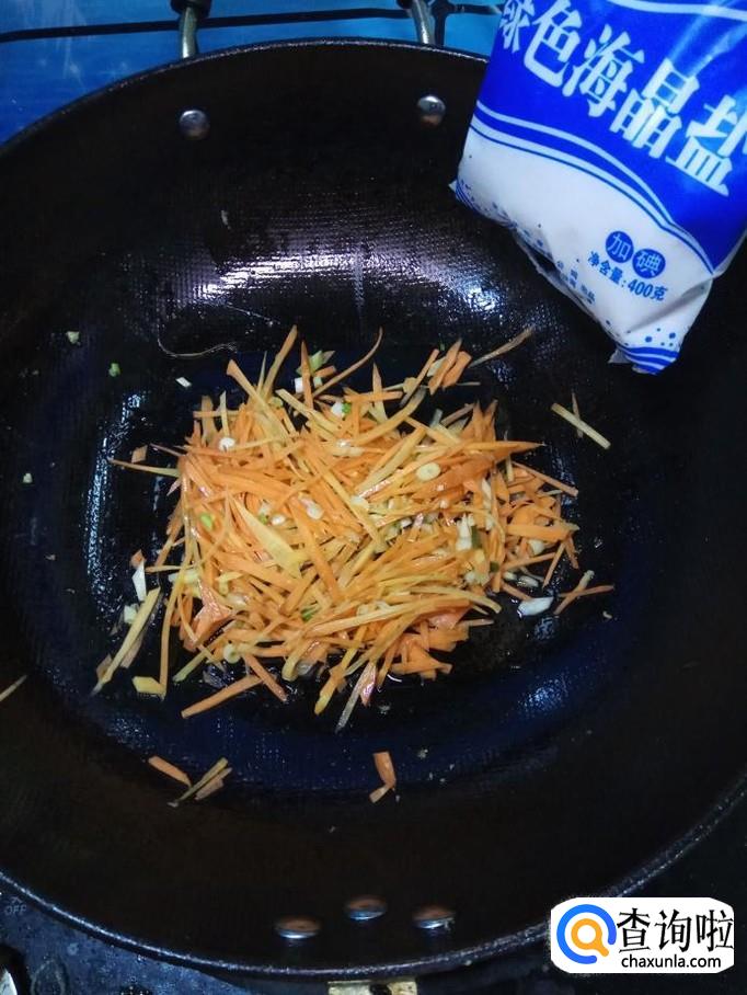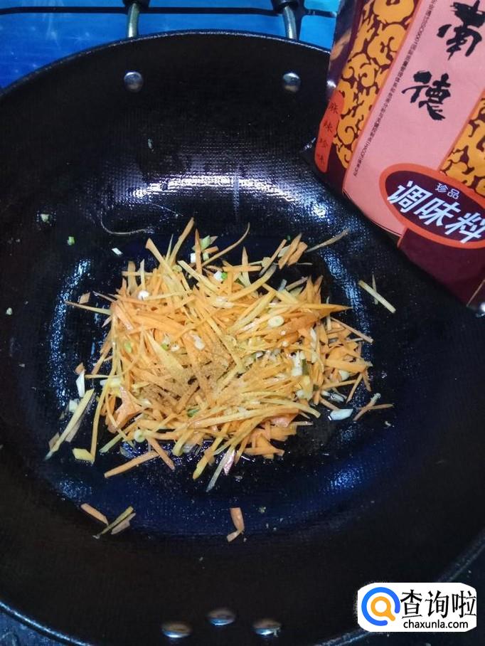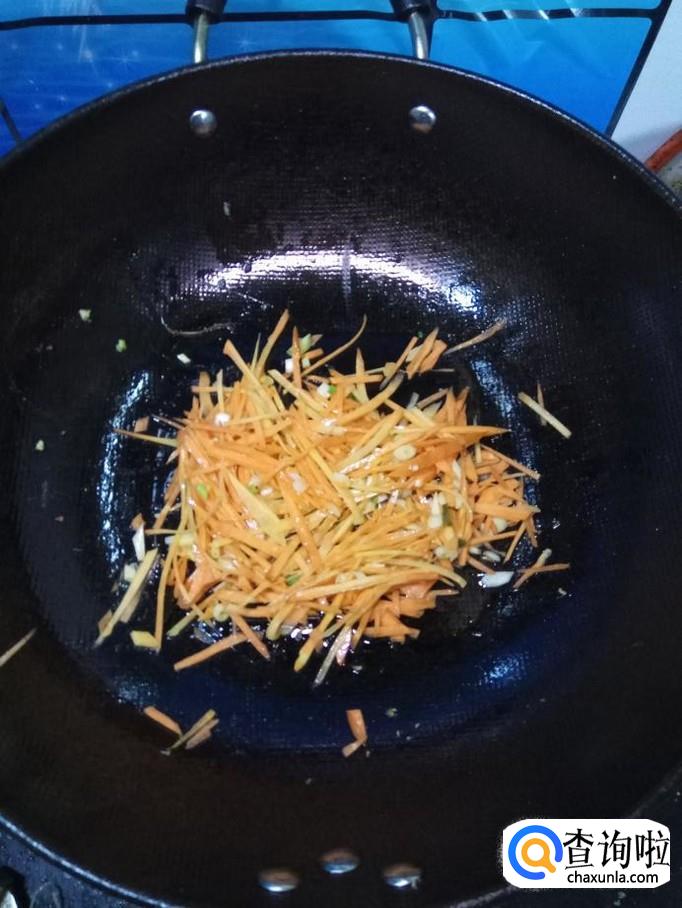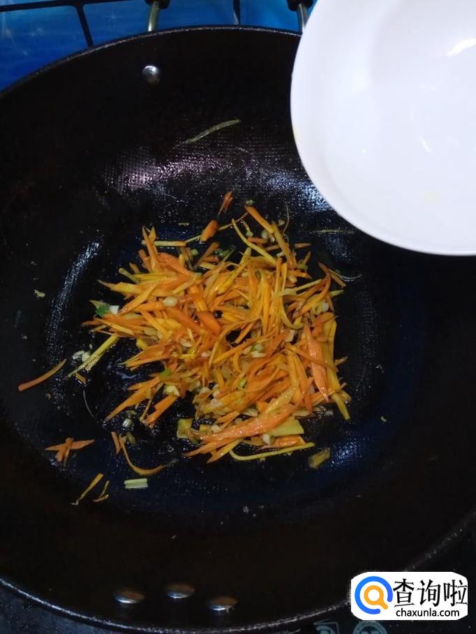 将切好的胡萝卜丝,倒入锅中,翻炒均匀。