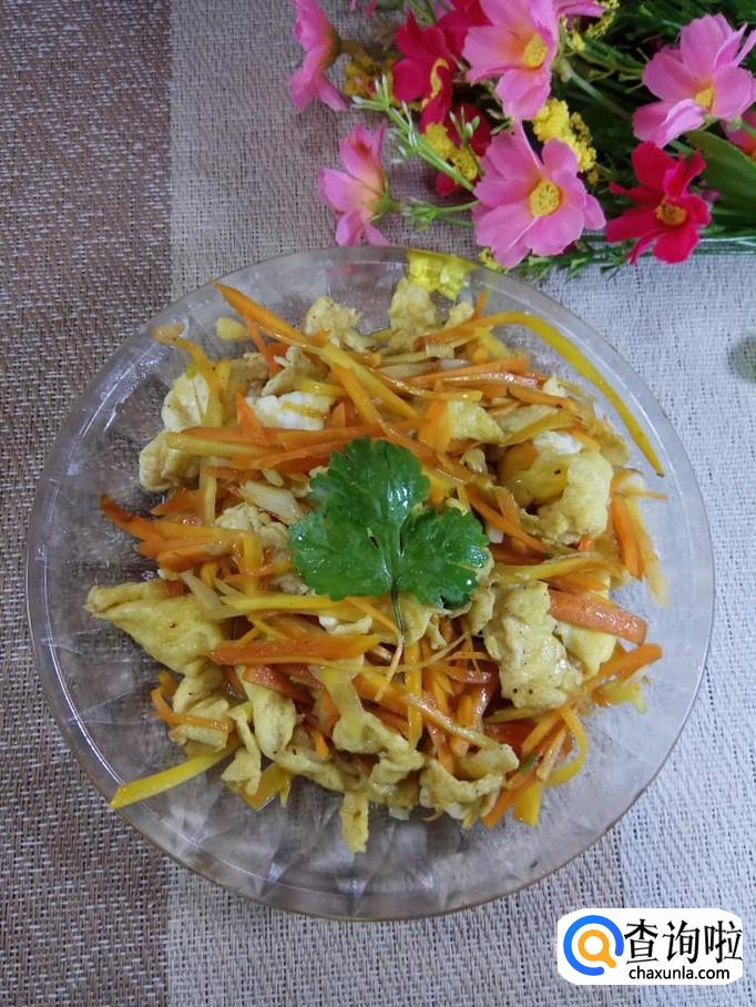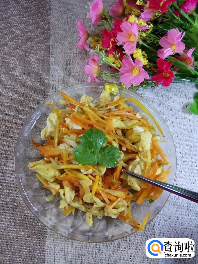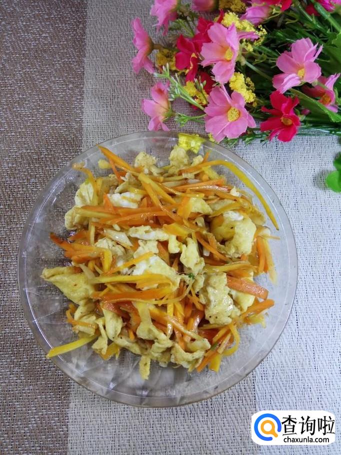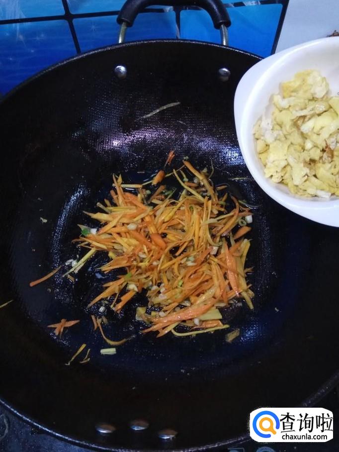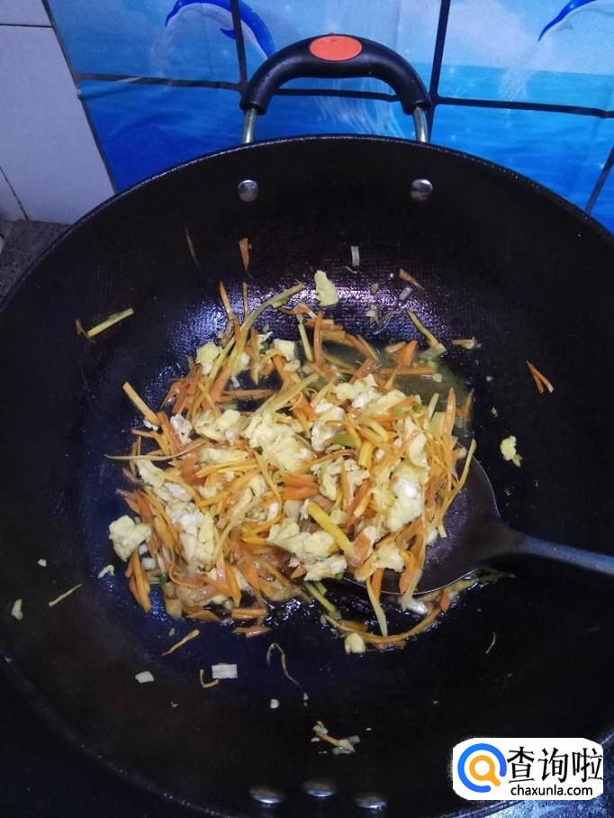 将之前炒好的鸡蛋放入锅中,和胡萝卜丝一起翻炒一下,让鸡蛋和胡萝卜的香味充分融合在一起。