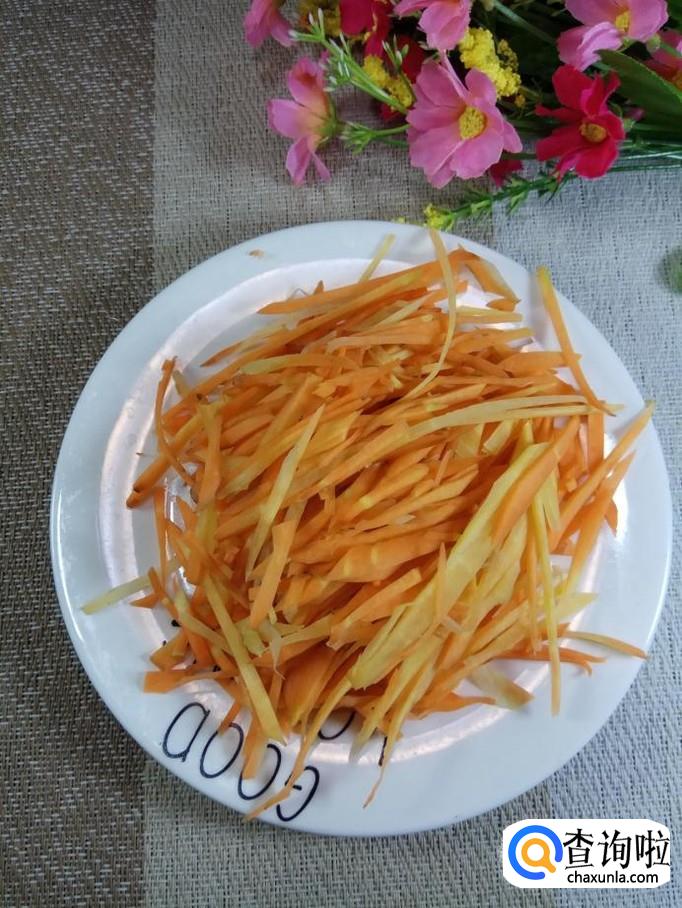 准备一个胡萝卜,洗净后去皮,切成细丝,放入盘中备用,胡萝卜切丝比较容易炒熟。