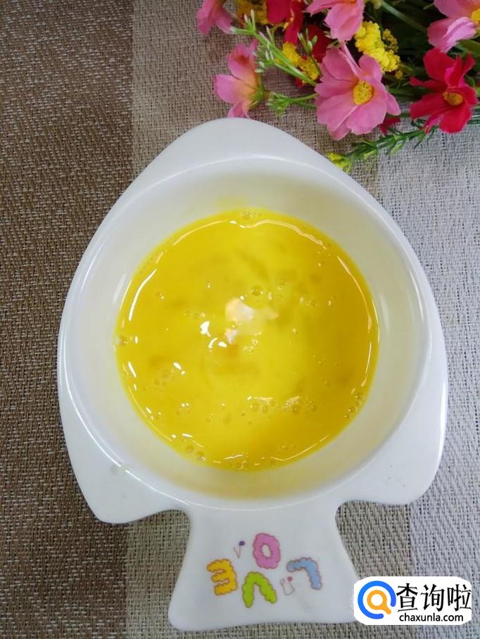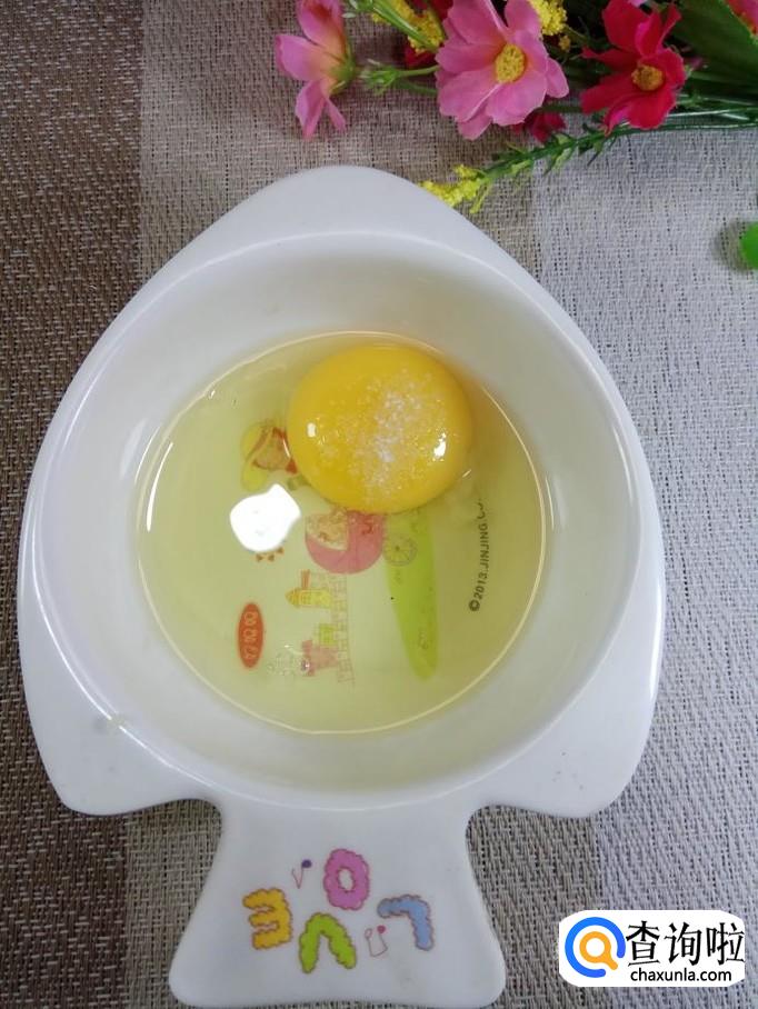 碗中打入一个鸡蛋,加入适量盐和料酒,打散备用。