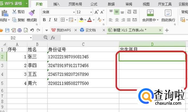 首先,我们打开Excel,并任意输入一些身份证号来演示。如图所示,我们需要在D列输出出生年月日。