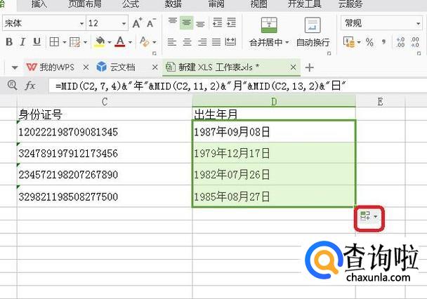 下拉单元格复制格式,就把所有身份证中代表出生年月的字符提取出来了,效果如下图所示。