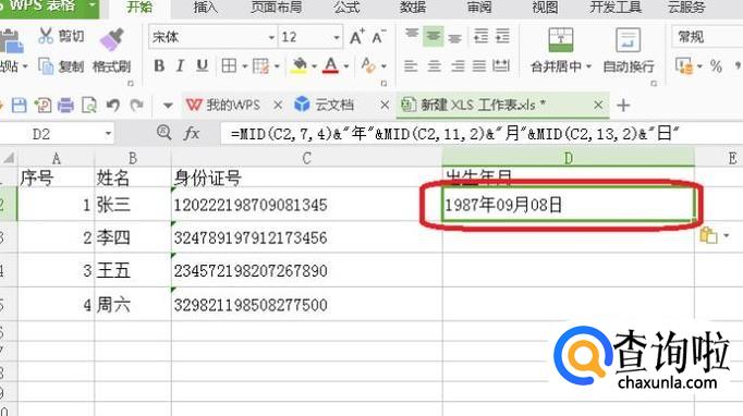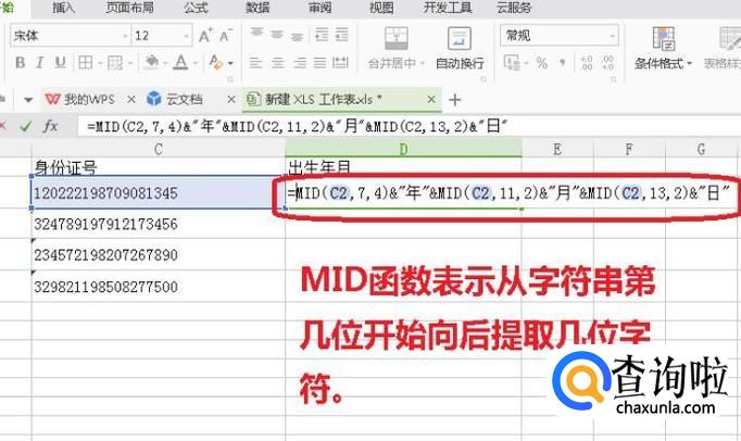 在D2单元格输入函数及公式:=MID(C2,7,4)&"年"&MID(C2,11,2)&"月"&MID(C2,13,2)&"日",按回车键结束。