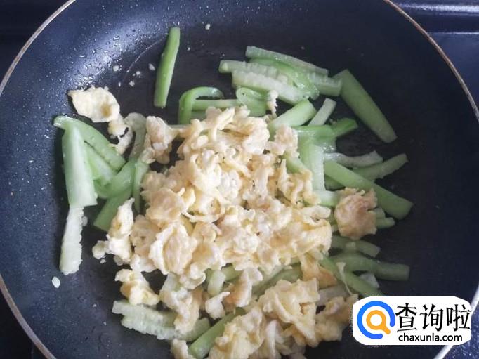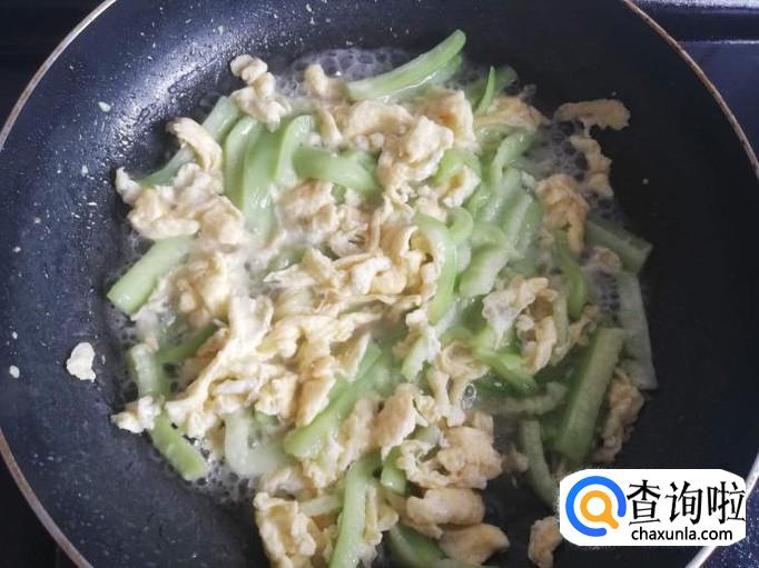 丝瓜炒断生后, 把鸡蛋倒进锅里,翻炒几下