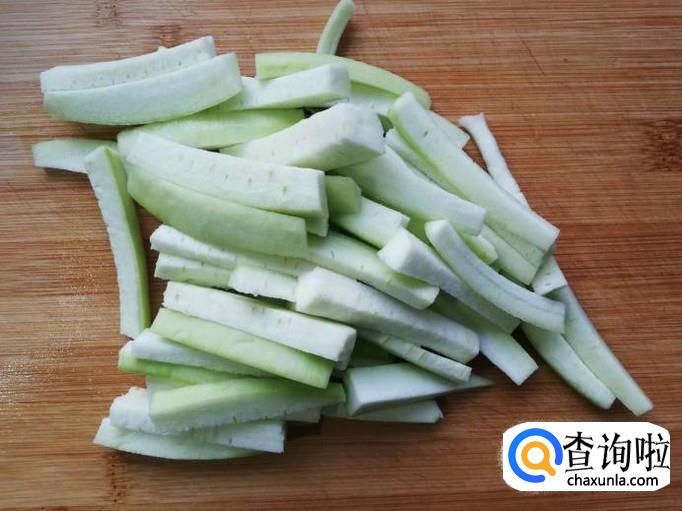 把丝瓜去皮,切成条,鸡蛋打成蛋液
