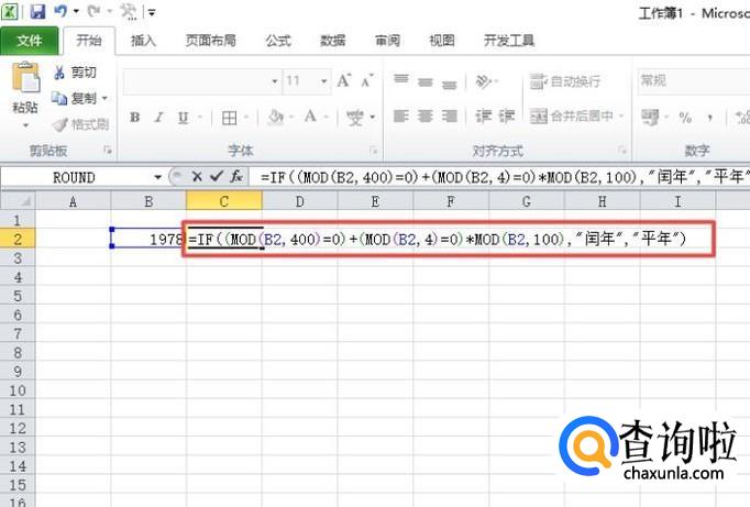 之后我们在图示中的表格中输入公式=IF((MOD(B2,400)=0)+(MOD(B2,4)=0)*MOD(B2,100),"闰年","平年"),然后我们按回车键;