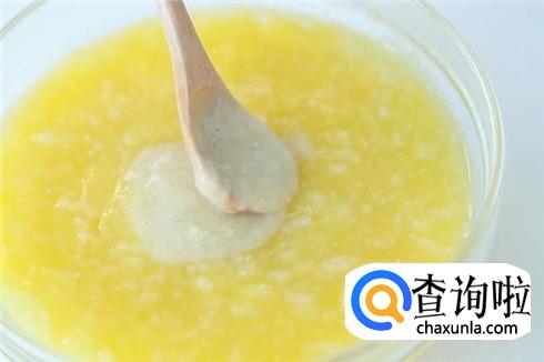 香蕉泥放进碗里,然后把刚刚烧开冷却的白糖水放进去,用勺子搅拌均匀,然后把柠檬汁也倒进去搅拌均匀。
