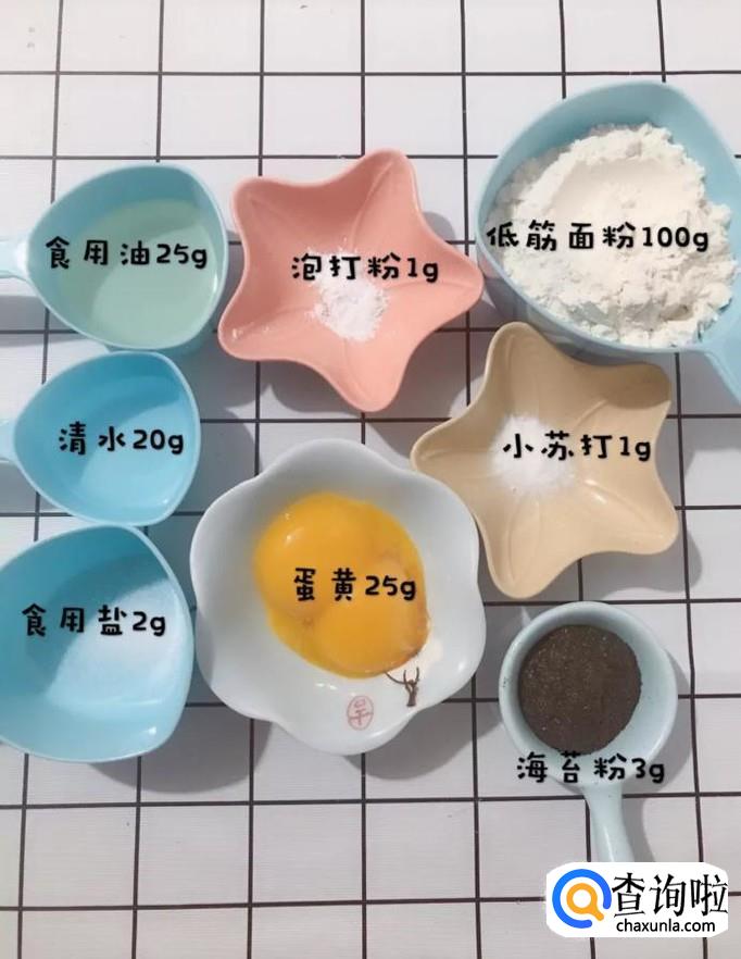 首先准备好所有要用到的食材,如下图所示。小贴士:食用油25克,清水20克,食用盐2克,泡打粉1克,蛋黄25克,小苏打1克,低筋面粉100克,海苔粉3克。