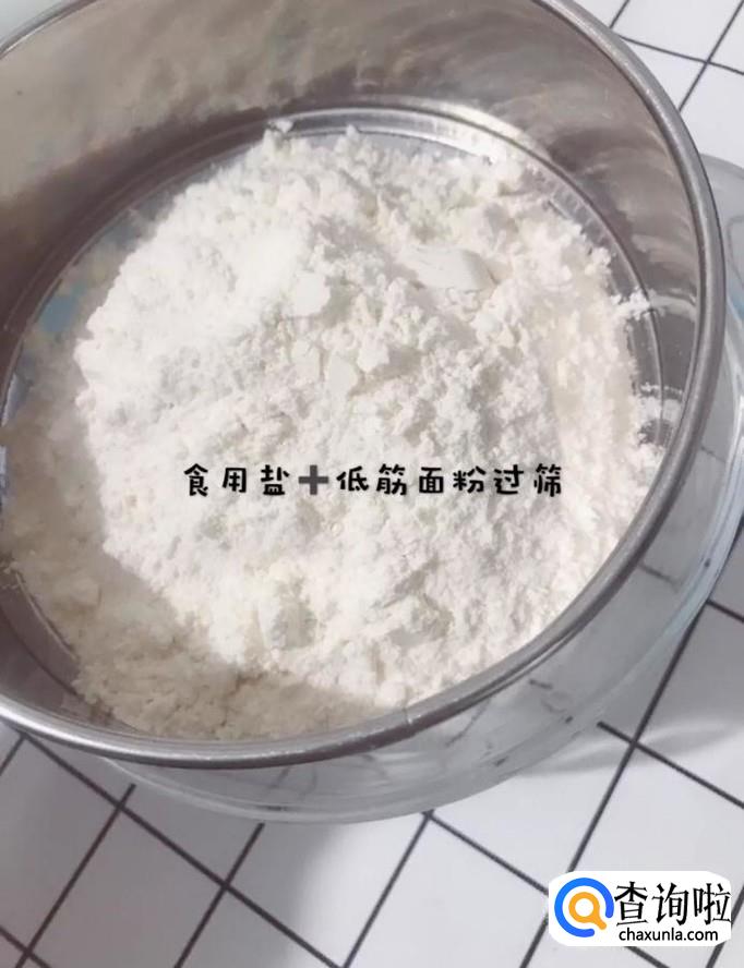 然后将低筋面粉和盐搅拌均匀,过筛,如下图所示。