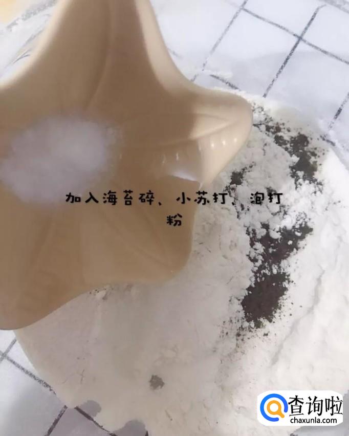 接着加入海苔粉、小苏打和泡打粉,如下图所示。
