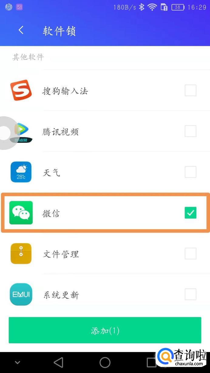 然后我们选择需要加密的软件,手机里的软件都可以加密,我们这里可以选择【微信】,然后点击【添加】。