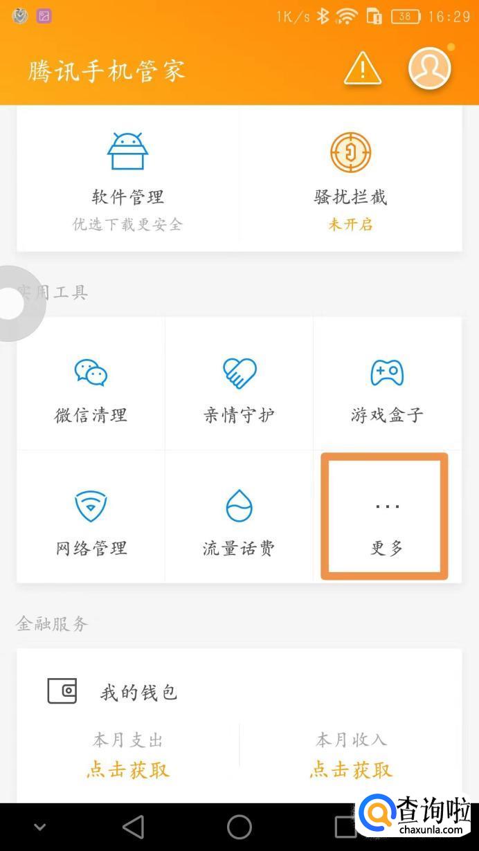打开手机管家,向下滑动,点击【更多】。