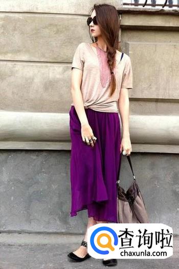 还有些紫色裙子搭配浅灰色上衣也是种活泼可爱的风格,在选浅灰色上衣时,要选蕾丝料子的这样搭配看起来很成熟,带有热恋的感觉。