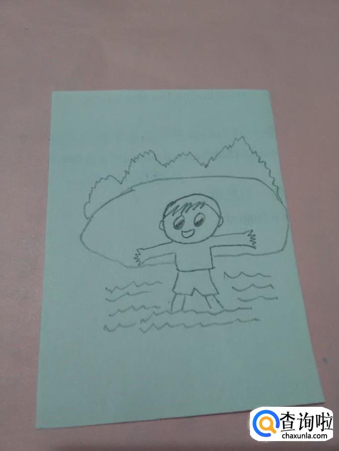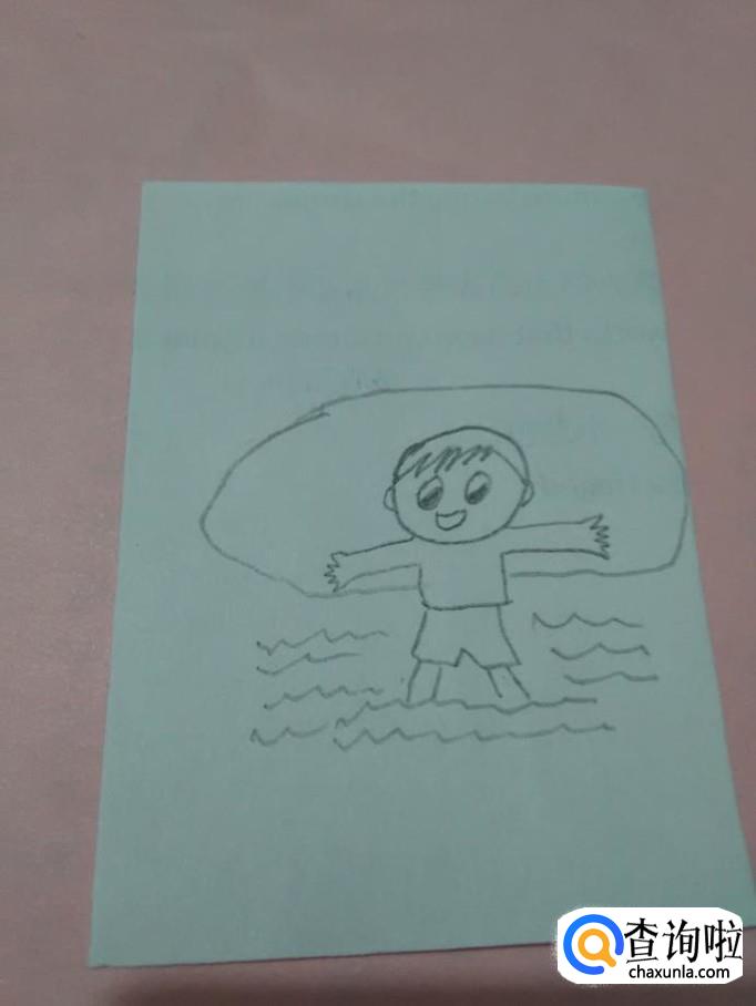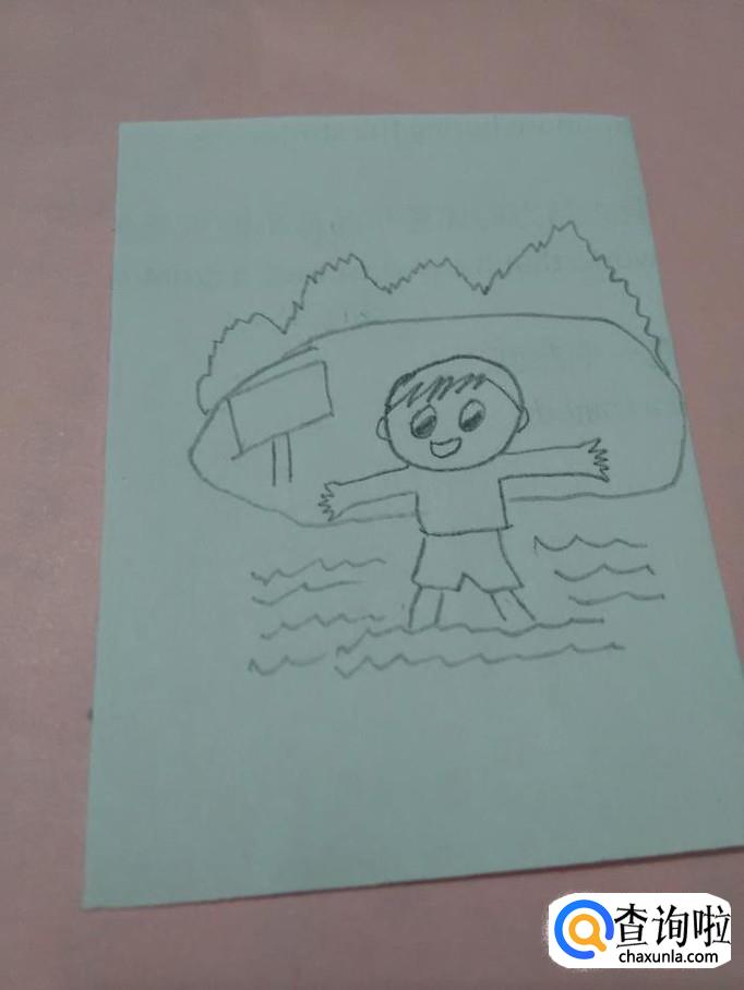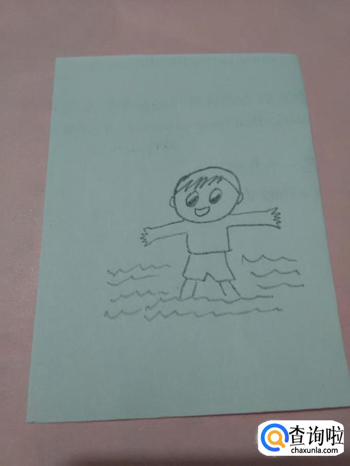 在男孩的周围,画几要波浪线,表示水面,表示男孩站在水里。