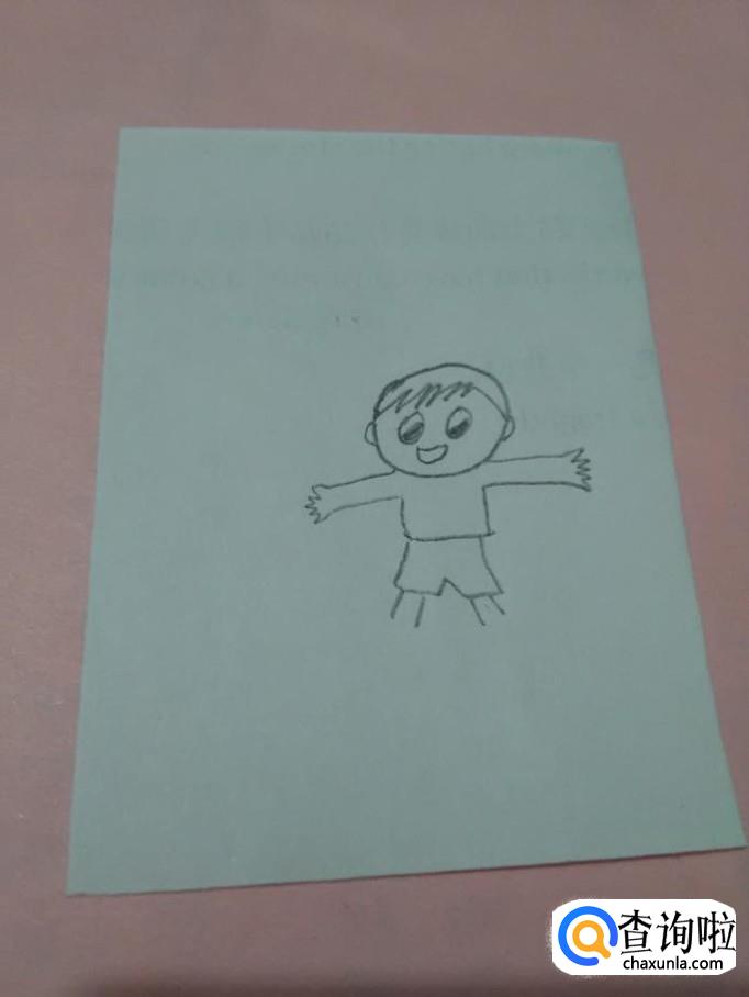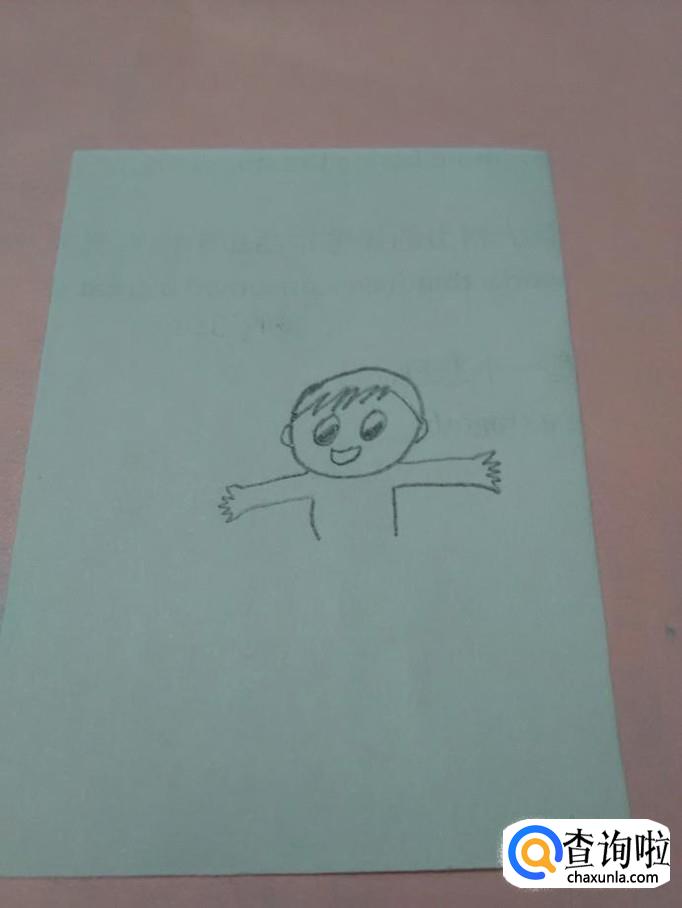 在头的下边画两个条状,表示胳膊,在胳膊末端画五个小的锯齿形状,表示手指,在胳膊下面,画两条竖线,表示上身。