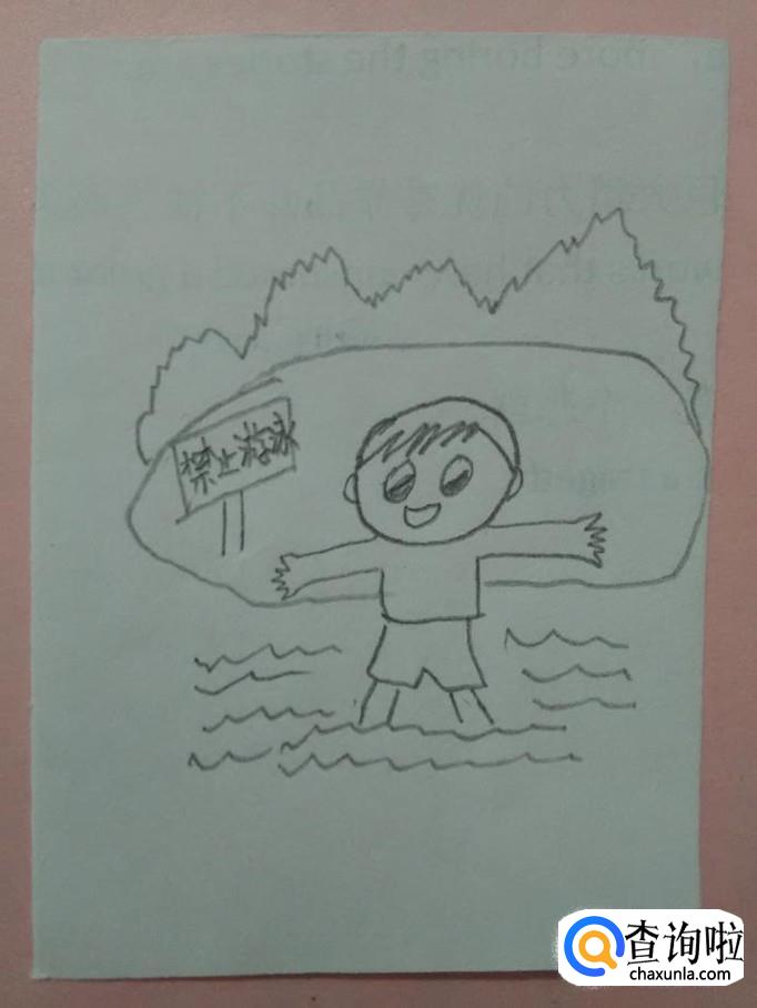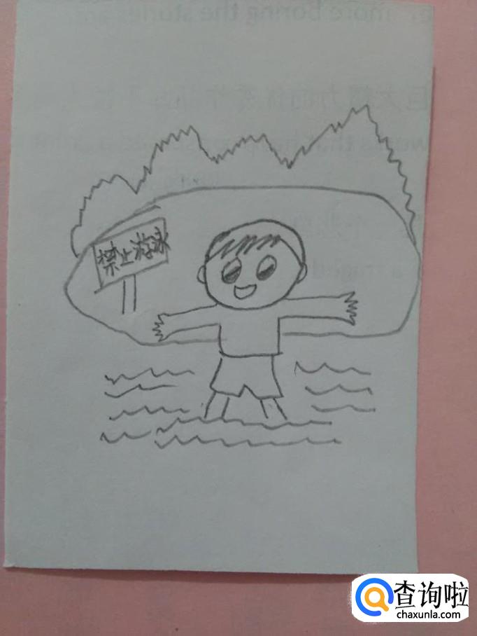在平行四边形中间,写上禁止游泳四个字。表示男孩不遵守警示牌的规定,擅自在不应该游泳的地方下水游泳,会有溺水的危险。到此,防溺水图片就画完了。