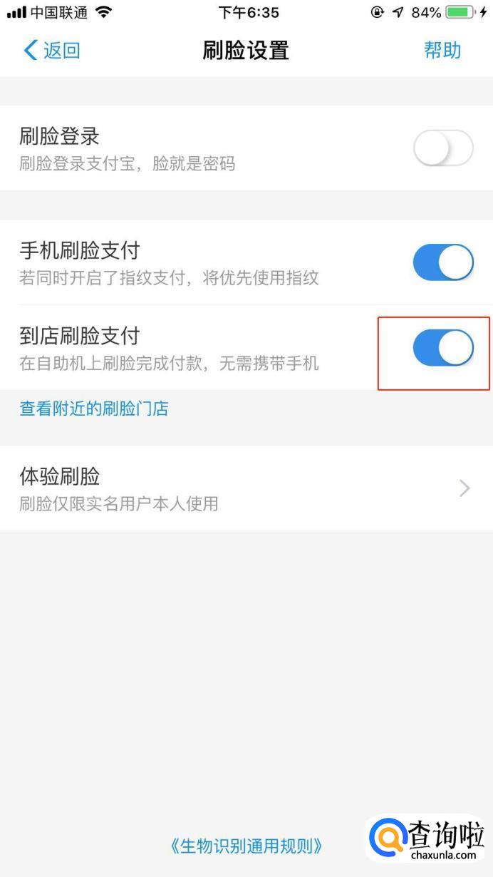 在刷脸设置界面中,找到“到店刷脸支付”选项,它的右边有一个滑块,现在是默认关闭状态,滑动滑块。