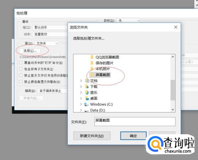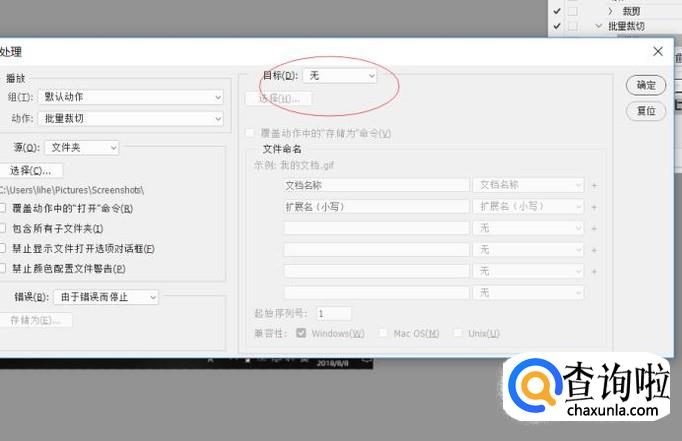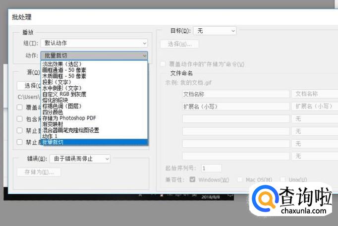 参数配置中,动作选择刚才建立的批量裁切,源,文件夹选择需要批量处理的文件路径,目标即输出的文件位置,可以不选,代表在当前目录下直接替换