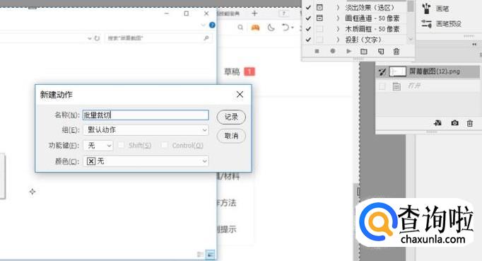 新建一个动作,命名为批量裁切,点击记录,如下图,这样就会录制接下来的动作