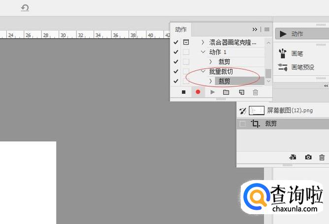 现在我们利用裁剪工具裁出右下角的一小块区域,enter键确认,观察刚才建的动作下面多了一个裁切,点击停止按钮结束动作录制
