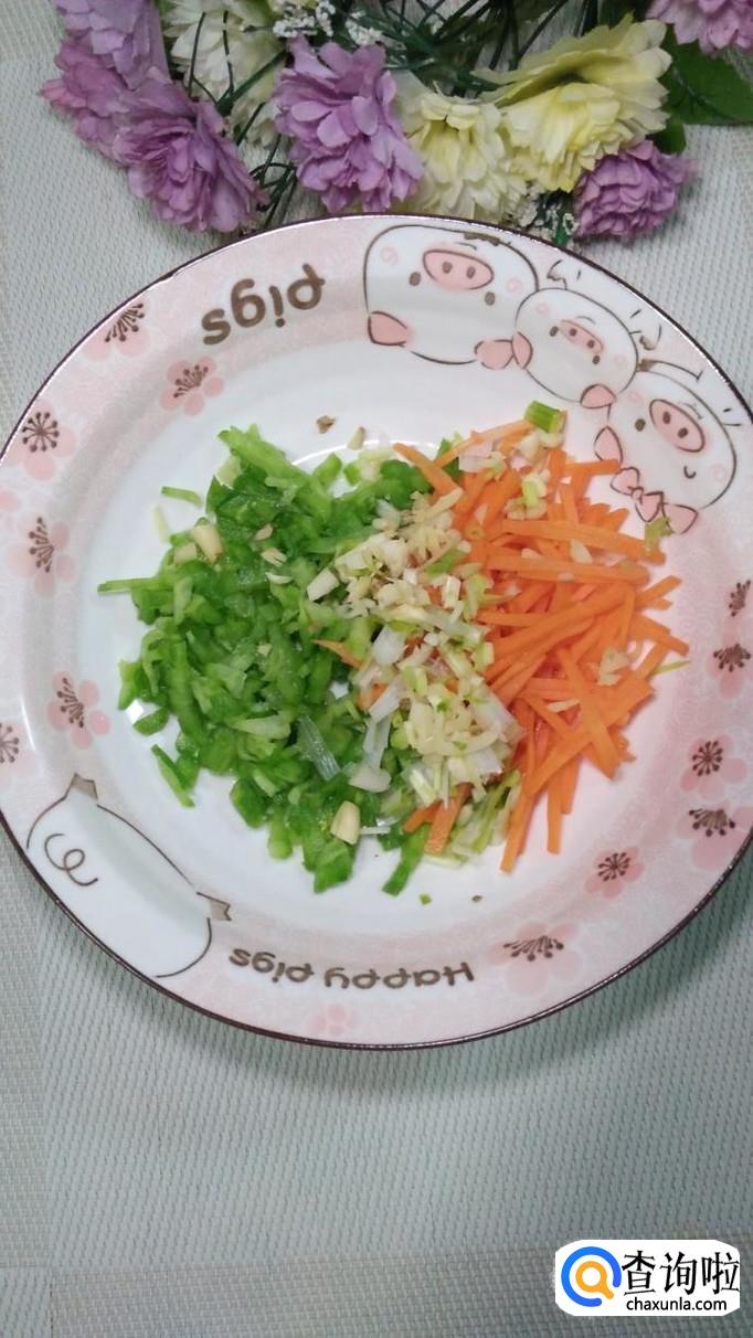 将葱姜蒜切碎后,和苦瓜,胡萝卜丝放在一起备用。