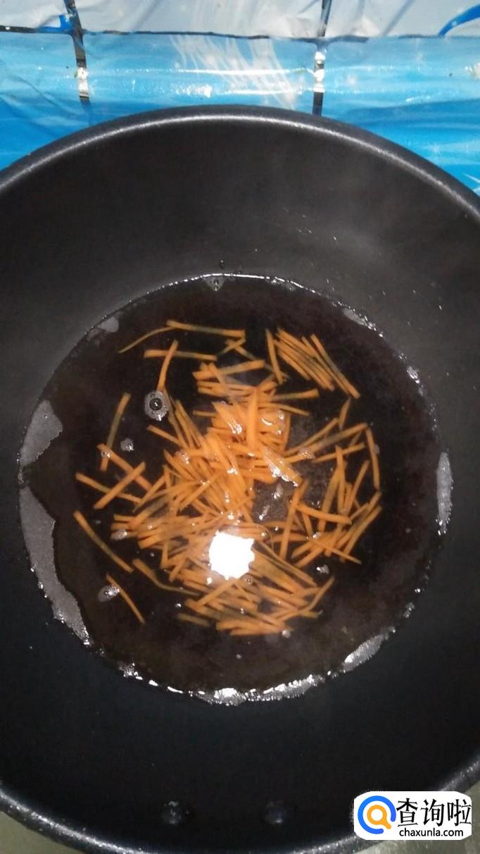 将胡萝卜切成丝,放入锅中焯水捞出,放入盘中备用,胡萝卜焯水的时间也不用太长,因为后面还要煎制。
