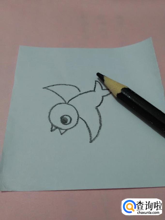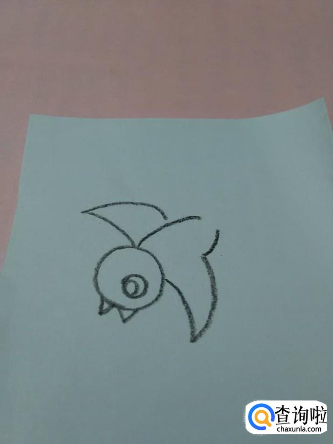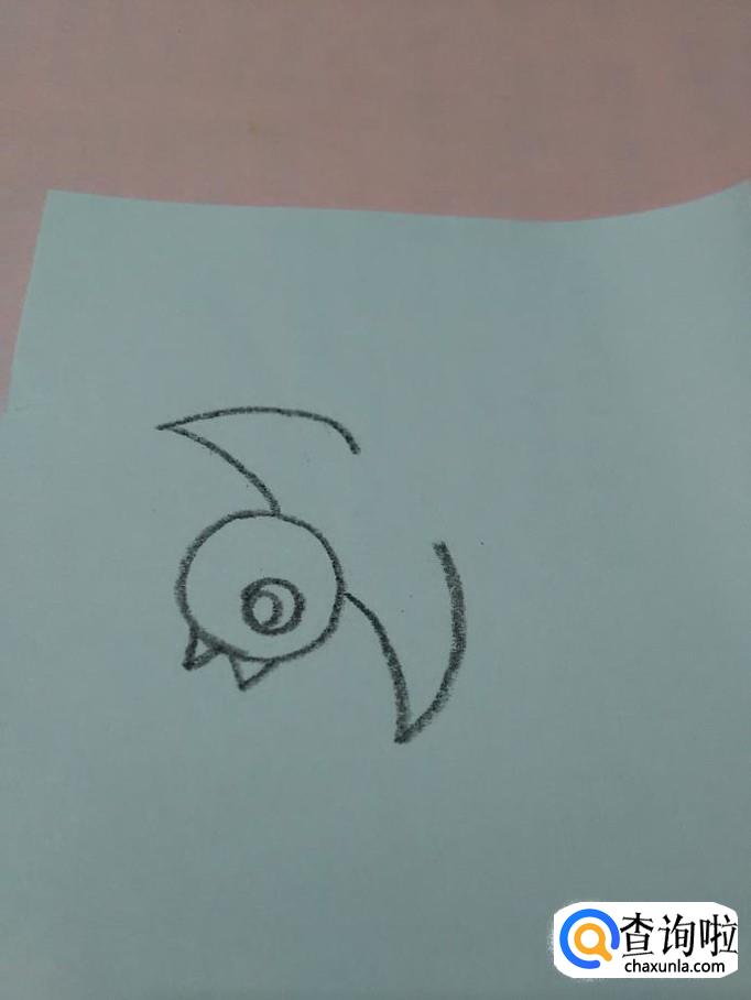 在头的右侧,画两条弯弯的折线,表示小鸟的两只翅膀。