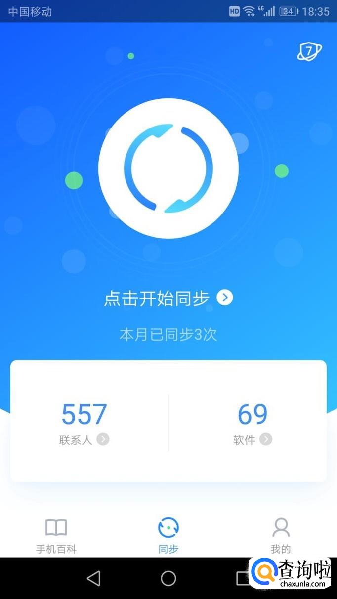可以看到下方有“手机百科”、“同步”、“我的”,直接点击“同步”,然后点击“联系人”进入。