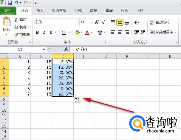 接下来,选中第一个已经含有公式的框,下拉数据,就可以得到一整列的百分比数据。