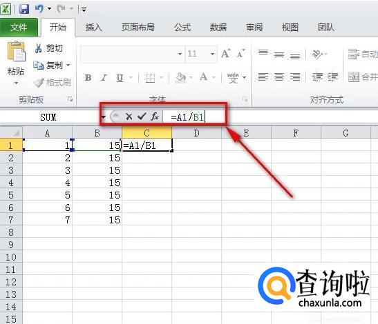 在编辑栏输入公式,公式的意思就是A列单元格的数据除以B列单元格的数据。