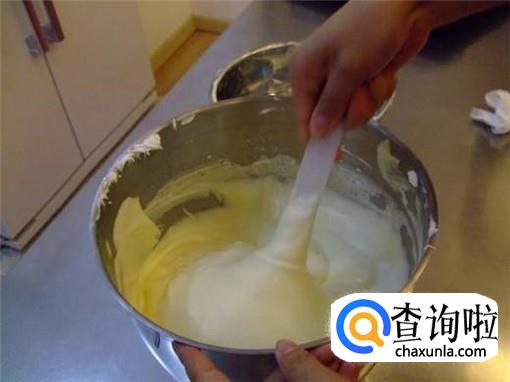 然后,我们将打散的蛋黄和面粉一起倒入蛋清打成的泡沫中,小心的搅拌均匀。
