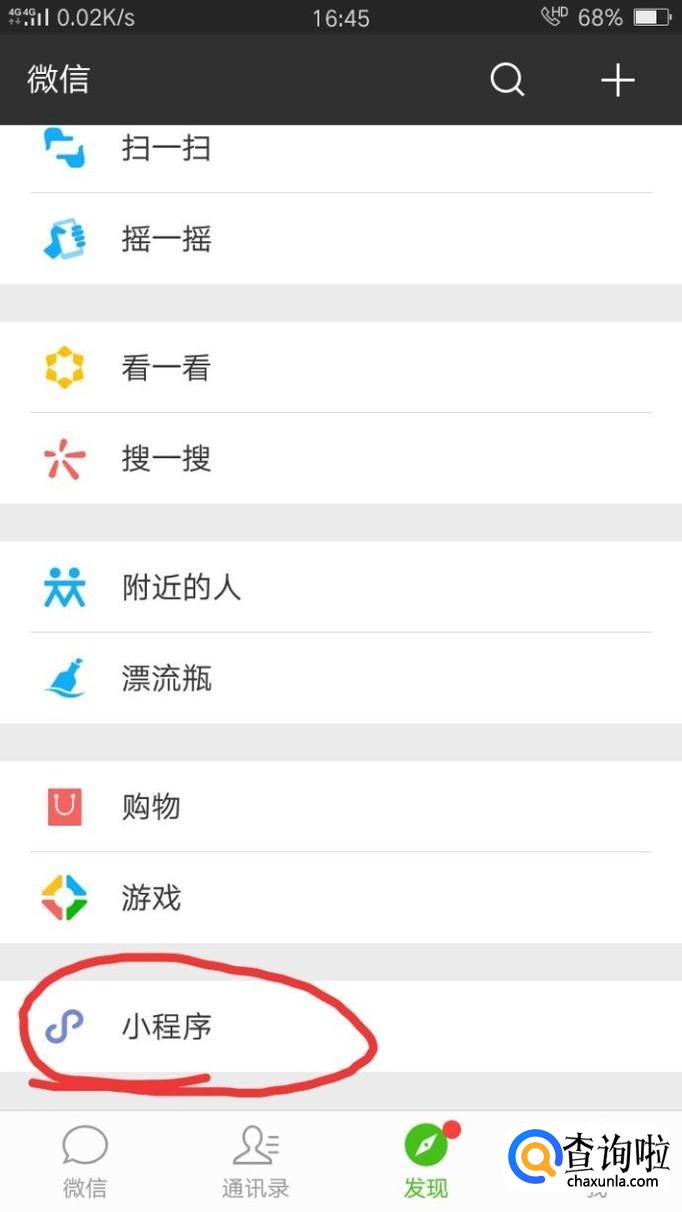 首先打开微信,点击发现,再点击小程序。