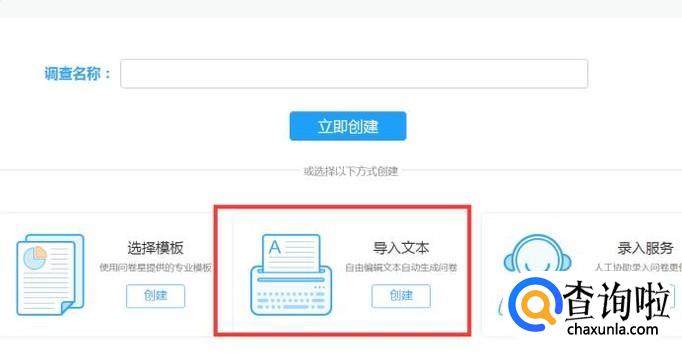 在调查问卷的编辑页面中,我们可以看到3中录入问卷的方式。其中就有一项是“导入文本”,我们选择“创建”。