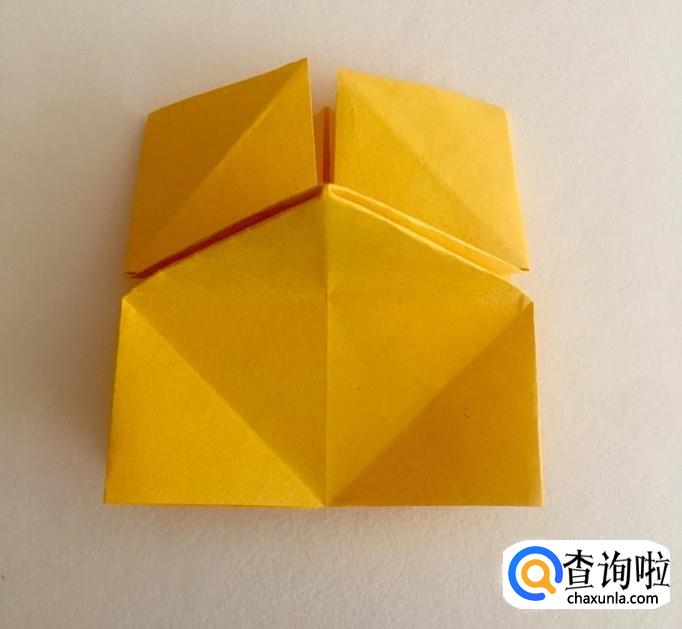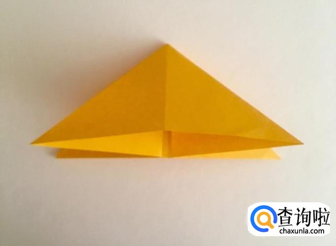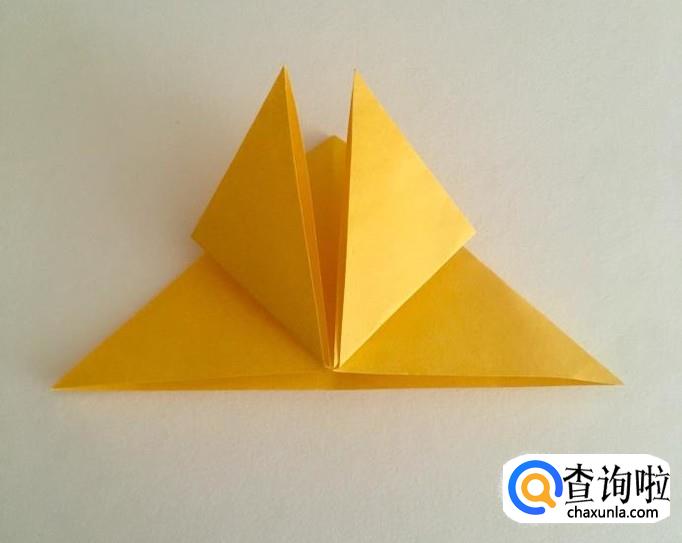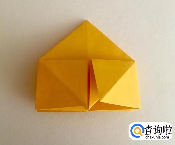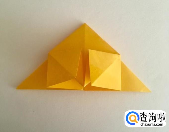 沿着中线,将三角形两侧的角向上折。然后,把这两个角向下压折出小正方形。