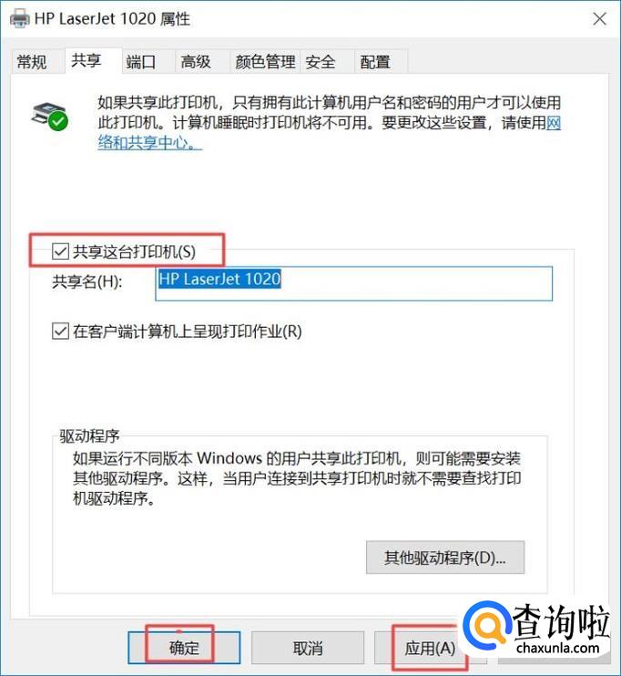 之后我们点击共享这台打印机,然后点击应用,之后点击确定就可以了。