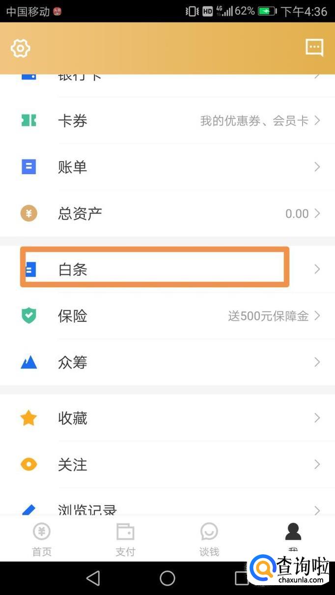 首先打开京东金融,然后找到我的,往下拉,找到“白条”,如下图。